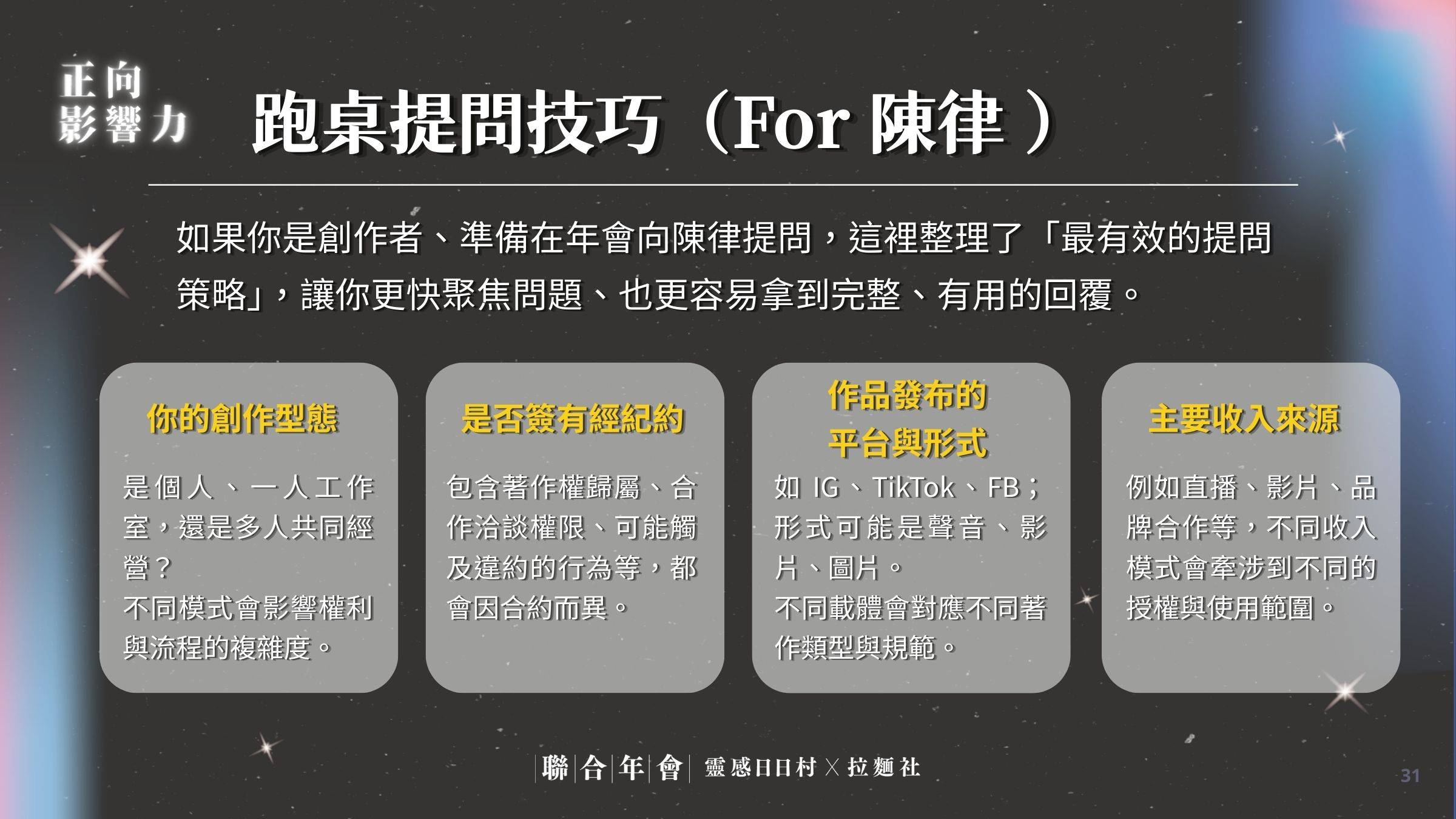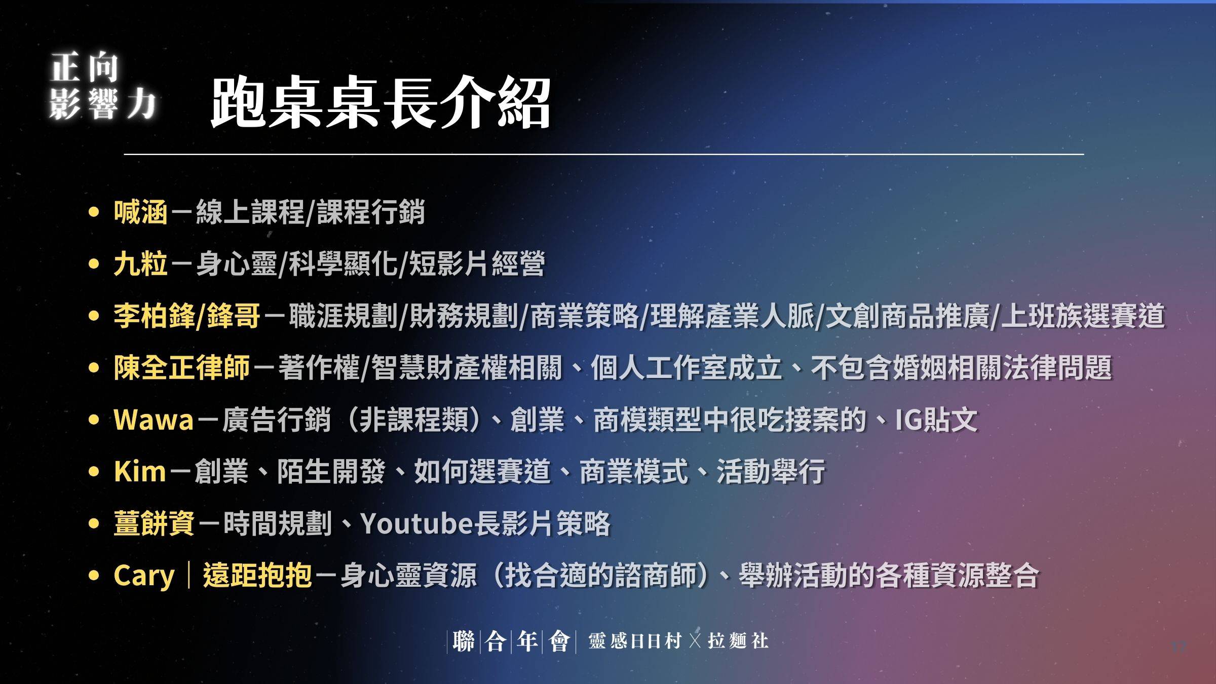 Newsletter 2025/12/19#聯合年會實用攻略 重點摘要 📌 本期重點內容: 正向影響力領航者介紹 Hi, Reader 感謝你持續關注靈感日日村~ 距離12/28 的 靈感日日村×拉麵社 聯合年會 已經進入倒數階段! 這幾日村長們馬不停蹄的進行各式各樣的採買與事前準備,期盼下週日能給予所有參與的共創者們更好的體驗 💪 繼上次介紹跑桌桌長們的擅長領域及提問技巧後,今天也幫各位整理好上半場座談的領航者代表們,將帶來的主題內容,邀請你在年會開始前一起先來預習! 年會上午場座談:正向影響力領航者 此次年會,我們以「正向影響力」為主題,而以為概念延伸出來的主視覺,更精準地描繪我們想傳遞的理念:在廣闊的宇宙圈層中,透過正向影響力照耀、傳遞信念給各方。 Think(思考)× Grow(成長)× Change(改變)× Action(行動) Think(思考)—— 增進自我認知,思考個人與外在的影響力 Grow(成長)—— 建立交流連結,拓展群體的正向能量圈 Change(改變)—— 跳脫舊有框架,拓展影響力的新想像 Action(行動)—— 明確2026年的行動方向與價值定位...